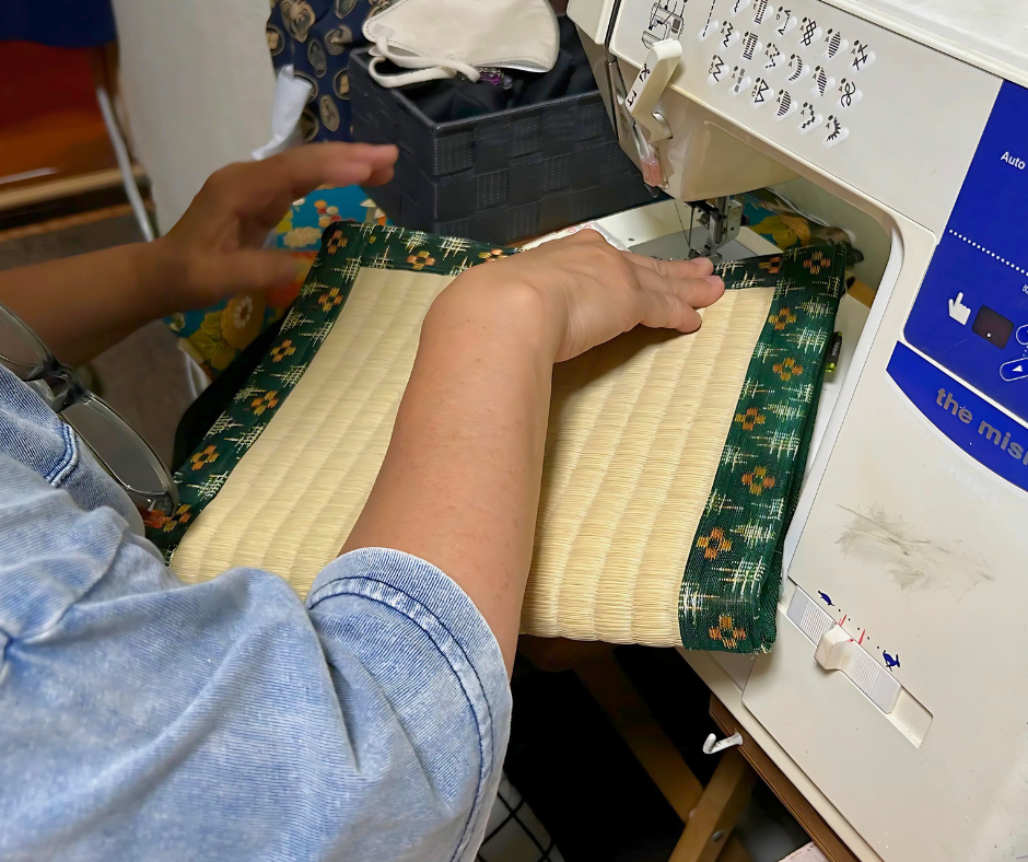 The firmness, durability, and sheen of tatami edges reflect the richness of our traditional culture. Due to its sturdiness, tatami cannot be sewn with ordinary sewing machines, and products made with tatami, such as bags, are almost non-existent in Japan.”